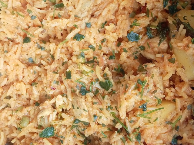 First wash and soak 2 Cups Basmati RiceIn a pot Add little Oil /ghee (Clarified butter)tuj (cinnamon stick) 2 Elachi (cardomom) 3 - 4 Whole black pepper 2 Cloves2 Green ChilliFew Curry leavesHeat and Allow aroma to ariseAdd 1 Large finely Chopped onionBraise till light goldAdd the washed meats Let it mix well with the above Add3 teaspoon Kashmiri Chilli powder1 teaspoon Crushed Red Chilli2 tablespoon Dhana powder(Use Dhana Jeera Mix if you prefer)+- 1 teaspoon tumeric Salt to taste BRAISE½ kg Cut up Chicken or MuttonAdd 1 teaspoon Ginger Garlic Paste½ teaspoon Garlic pasteLet Chicken Change to a creamy colour Add 3 medium Grated TomatoMix well cook few minutesAdd 2 tablespoon MaasCOOK(optional)Add handful of steamed Veges Or Just Peas Or Just Steamed Carrot RoundsAdd +-4-5 Fried potato HalvesHandfull of Chopped Green dhania (coriander)Now DRAIN AND ADD the Soaked 2 cups Basmati riceMix wellAdd +- 2 & ¼ cups Water (Careful not to add too much water) Cook few minutes on Stove 10 minutesThen Cover with foil And Bake in Oven at 180* for 1 ½ Hours Optional is Wagaar with just Jeera and ghee (Clarified butter) and garnish with Chopped Green dhania (coriander)Serving SuggestionSalad with a Difference Grated carrot with chopped onion chopped Green peppers chopped Green dhania (coriander)Mayonnaise 1 teaspoon Sugar or Condensed