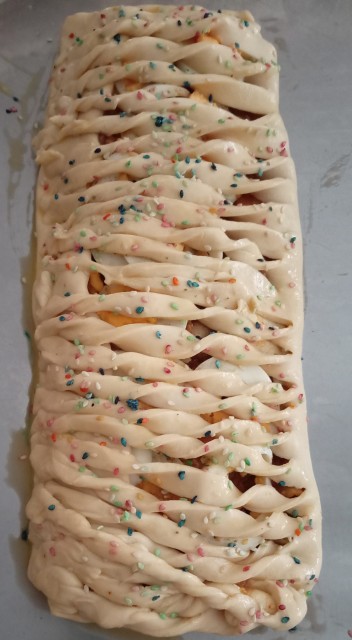 Use your favourite butter Puff PastryRoll into a rectangle the size that you preferPlace if on a greased baking trayPlace filling on bottom half of the PastrySprinkle a bit of oreganoSprinkle onion slices, tomato cubes and egg slices over Sprinkle a dash of white pepper over the egg slicesCut the other top half into thin strips Pull and twist over the bottom half to close up the pie (See Picture image)Egg Brush Sprinkle with Sesame seeds or Poppy Bake in oven at 200 for +-15-20 minutes then drop temp to 180 for +-10 or until done Enjoy 😋