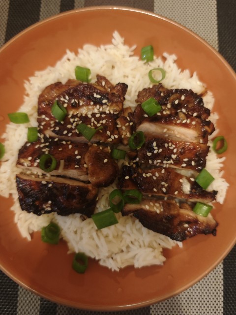 Debone thighs and soak in water, salt, vinegar for 15 minutes then rinse.Marinate chicken in sauces and spices for 2hours to overnightPlace in air fryer liner and cook until done.180deg for 15-20 minutes.Saute leftover marinade with little extra honey until sauce thickensUse as extra dipping sauce Serve with plain rice or egg fried riceGarnish with spring onion and sesame seeds