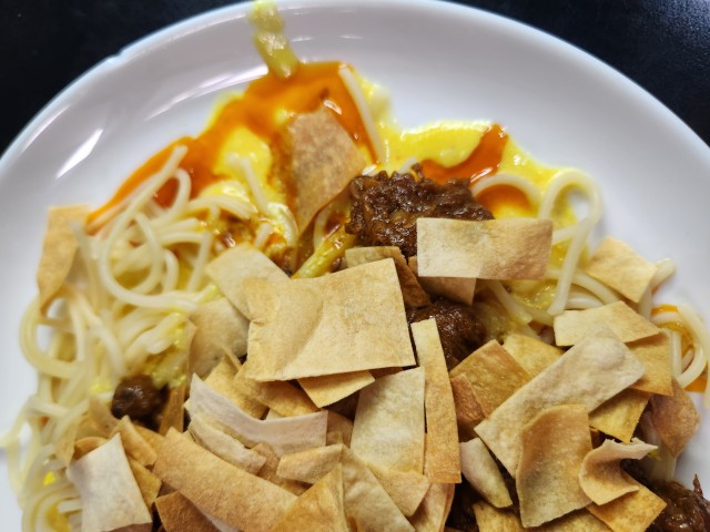 Assembly1 packet boiled spaghettiTop with kari + steak curryAdd crispy fried pur strips, spring onions/fresh coriander, fried shred potatoes, crushed chillies, nuts & a squeeze of lemon 🍋