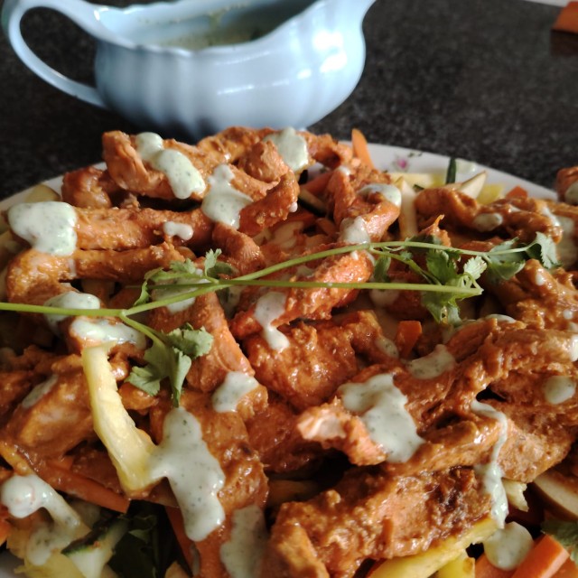 1. Chuck the chicken into a pot and add the mayonnaise, tomato puree, oil, lemon juice, jeeru (cumin), dhana, chilli powder, arad (Turmeric), your spice and salt. Mix well and cook for Β±30 minutes on low heat or until cooked through, must be super juicy. Check the seasoning, adjust to your taste buds. 2. To make the dressing, put all the ingredients into a blender and blitz until smooth.4. To serve, top chicken on the layered salad. Drizzle over the dressing and serve immediately.