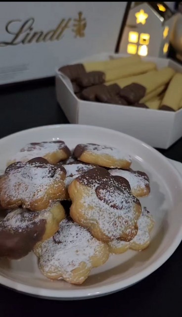 ✨ Flower biscuits• Cut flower shapes.• Brush tops with egg wash and place an almond in the centre.• Bake, then dip half the biscuit in melted chocolate.• Once set, dust the other half with icing sugar.