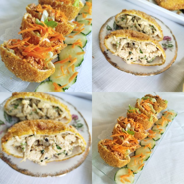 1. Take a slice of bread.With a big cutter cut out circles.. Dip in egg/laii and bread crumbs. Fry on medium heat till done .Make slits in the middle.. open the pockets with a knife. Fill chicken and some shredded lettuce.